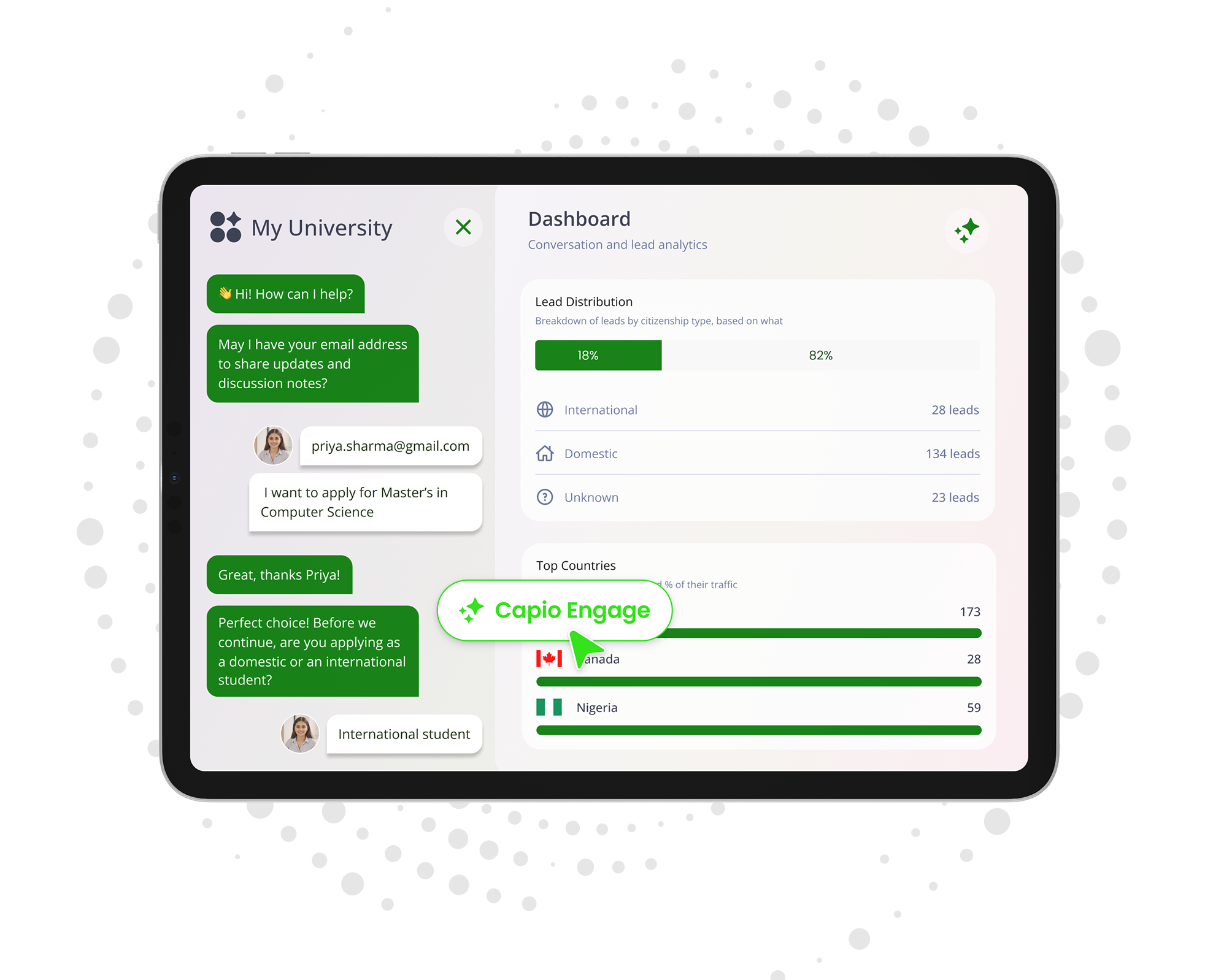 Capio Engage is an AI-powered student engagement platform that guides prospective students throughout their journey on your website.